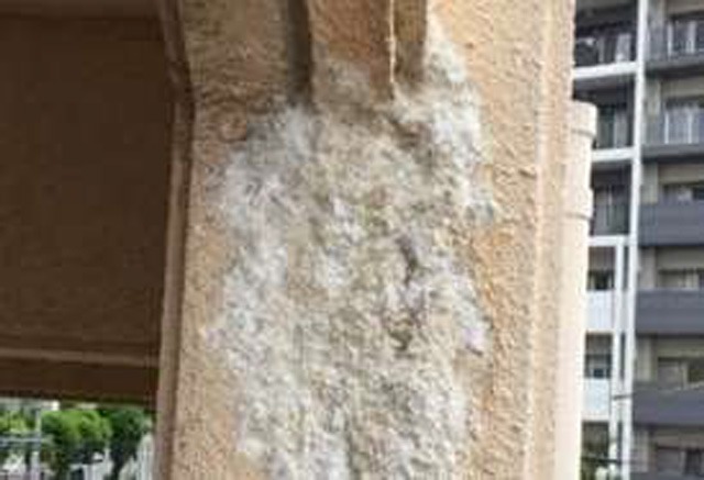 鉄筋の錆によって膨張し、コンクリートが破裂する現象です。建物の強度低下を招くため早めの補修が必要です。