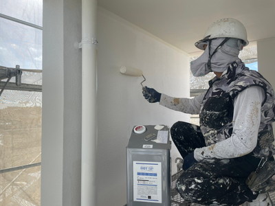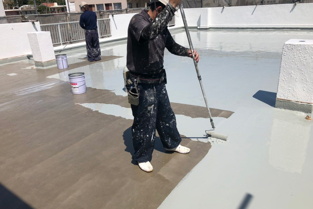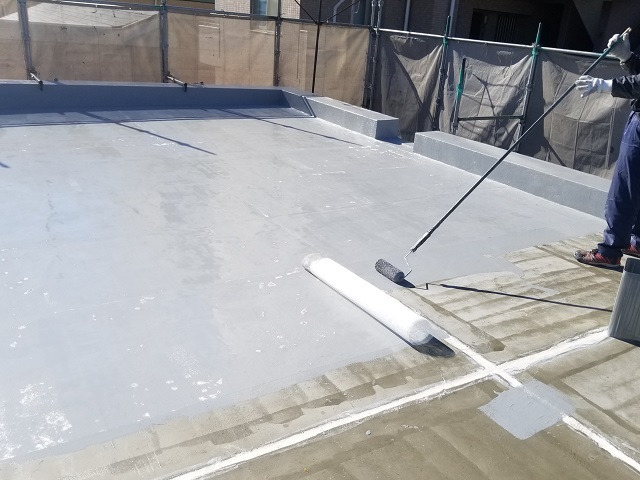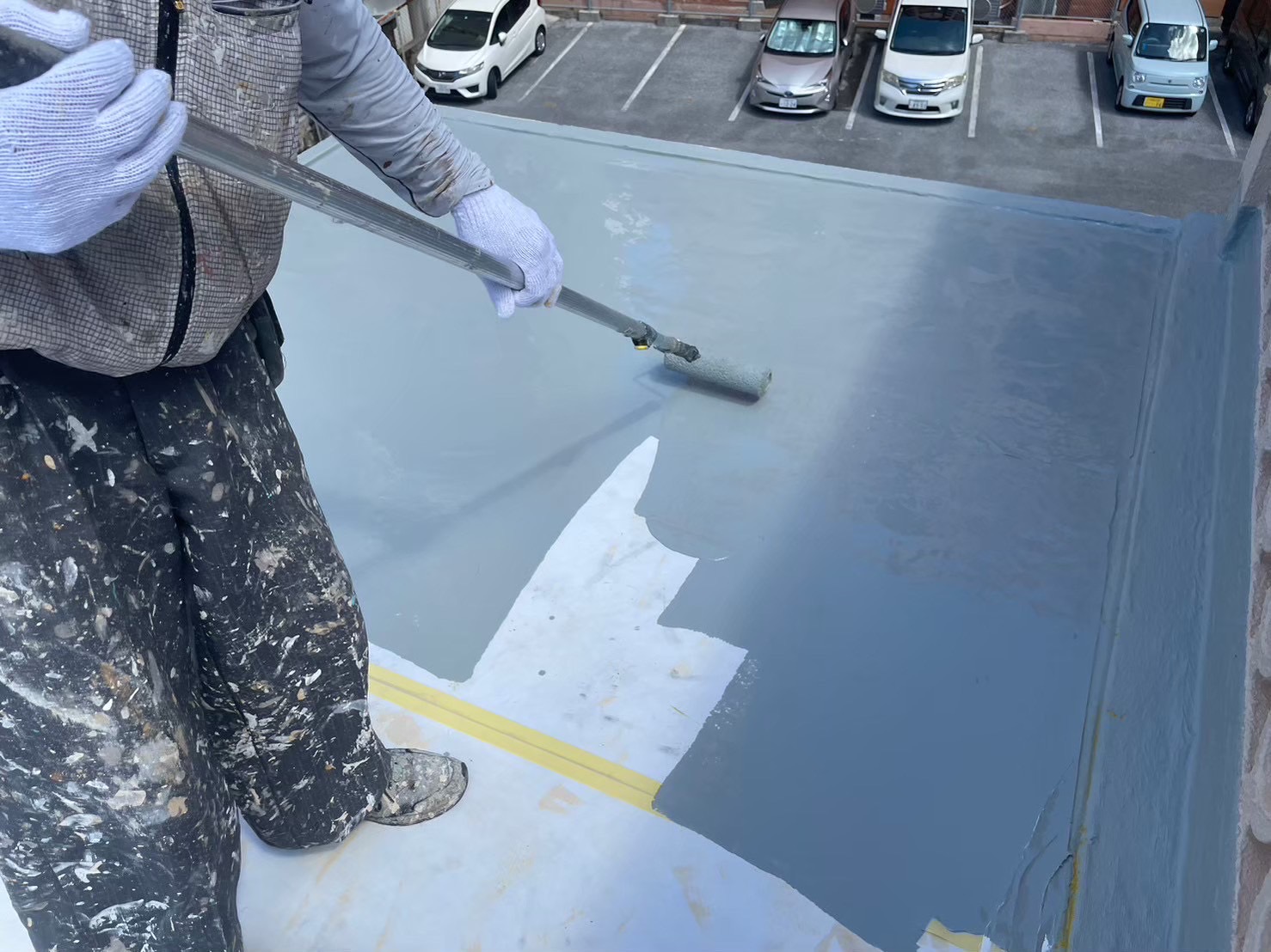 雨などの水が溜まりやすい場所には防水塗装を行います。水勾配をつけたセメントの上に下塗りをしたうえで、外壁同様に中塗り(ゴム材)、上塗り(遮熱材)と行います。 このとき、中塗りも上塗りも2度塗り施工で行います。防水工事は塗膜に厚みを持たせることで丈夫な防水層を形成します。そのため、仕上げ材(遮熱材)は通常1度塗りですが、沖心組では2度塗りを行い、より厚く丈夫な防水塗装を心がけております。