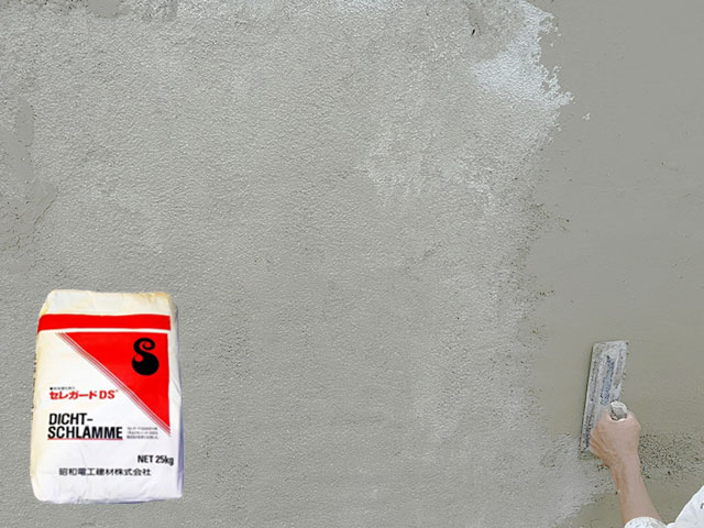 主に、地下や土に面してしまう壁など、表面塗装を行わないような部分には、躯体自体に防水性を与える無機質浸透性防水塗装を行います。コンクリート表面に直接塗ることで内側に浸透し、表面に防水層をつくります。 塗料を浸透させる必要があるため、下地が乾燥状態にある場合は、しっかりと水打ちを行います。